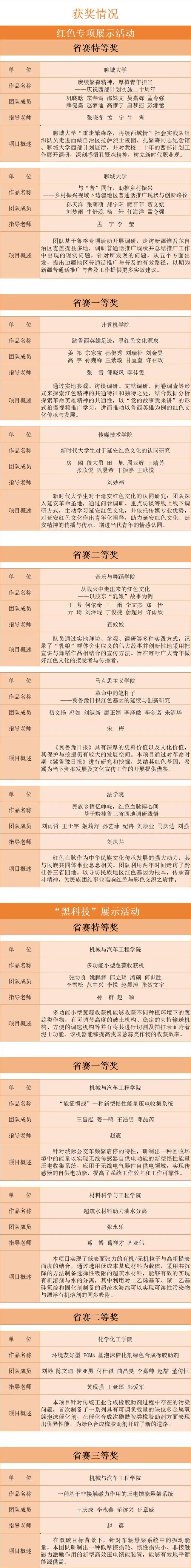 根据第十八届“挑战杯”全国大学生课外学术科技作品竞赛组委会统一安排,山东省组委会在“挑战杯”省赛框架下分别举办了红色专项和“黑科技”展示活动。本届红色专项展示活动以“实践感悟新时代,挺膺担当新征程”为主题,广大青年学子通过社会实践接受红色教育,以丰富的成果展示感召更多青年,全省共通报表扬320项作品,其中特等奖65项、一等奖73项、二等奖91项、三等奖91项。在“黑科技”展示活动中,围绕“卡脖子”问题、前沿领域、高精尖技术,大学生科创团队创造性地解决各类生产生活中的难点问题,全省共通报表扬104项作品,其中特等奖16项、一等奖28项、二等奖28项、三等奖32项。
