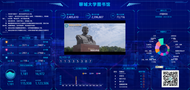 此外,图书馆通过智慧数据墙,采用大数据、物联网等技术,构建基于微服务架构的数据中台,实现图书馆对人、资源、设备等要素的全面感知、广泛互联、无缝对接与可视化管理,馆情数据实时呈现。该平台实时呈现读者进出馆流量、座位预约、图书借阅、馆藏分类、图书借阅排行、读者借阅排行等数据信息,读者可获取信息浏览、阅读导引等服务。同时,通过智慧数据墙还可以图片、音频及视频的形式展示图书馆举办各种活动等信息。另外,图书馆还通过多媒体播放电子屏,实时展示图书馆数字资源、阅读活动、专家讲座等信息,以宣传和推广图书馆的馆藏资源和服务项目。