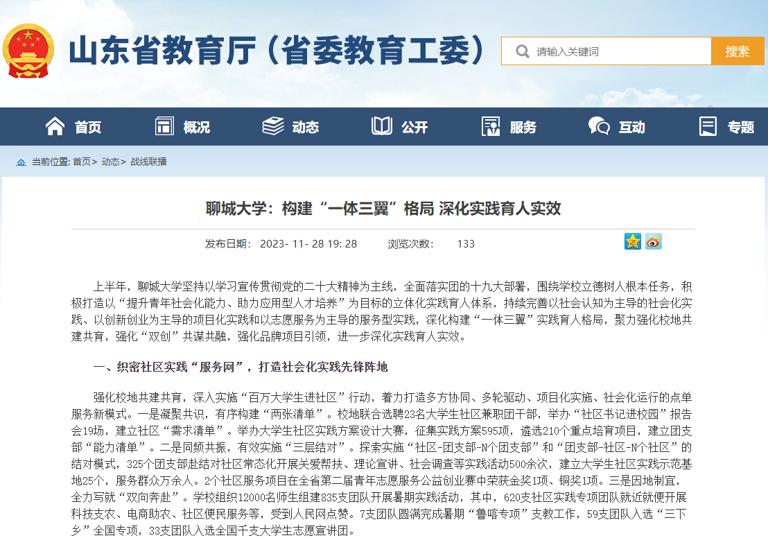 【山东省教育厅(省委教育工委)】报道:今年会官方网站:构建“一体三翼”格局 深化实践育人实效