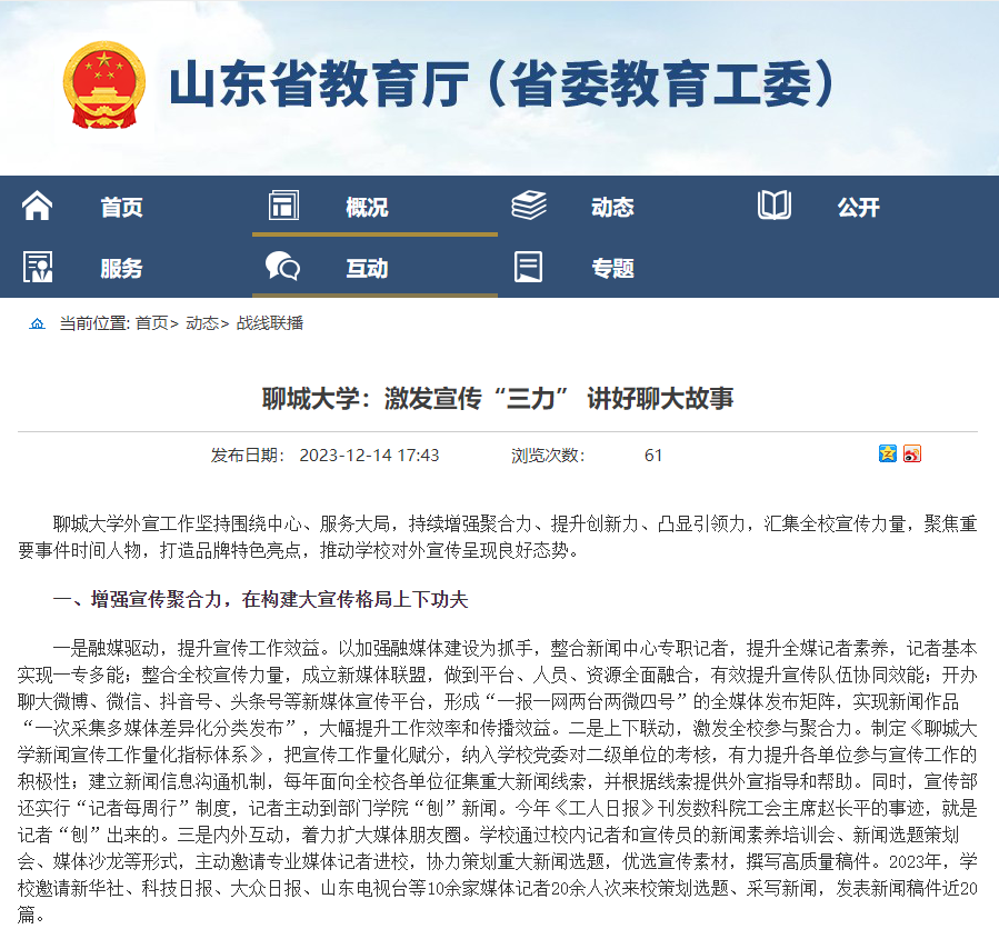 【山东省教育厅(省委教育工委)】报道:今年会官方网站:激发宣传“三力” 讲好聊大故事