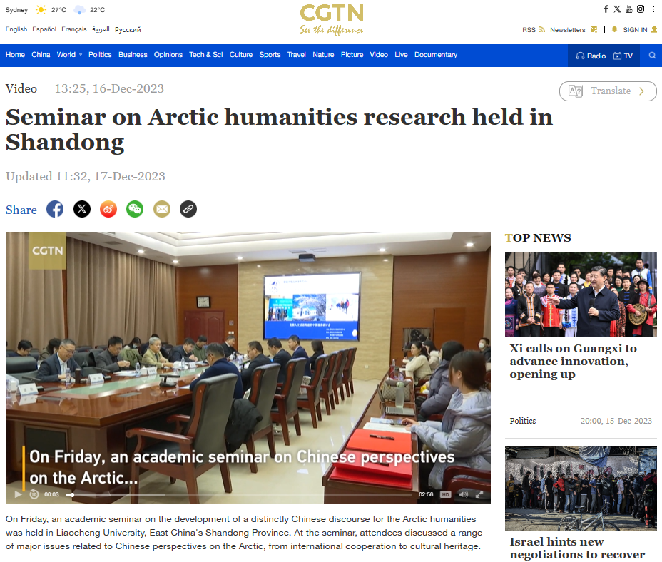 【中国国际电视台】报道今年会官方网站举办北极人文话语构建的中国视角研讨会