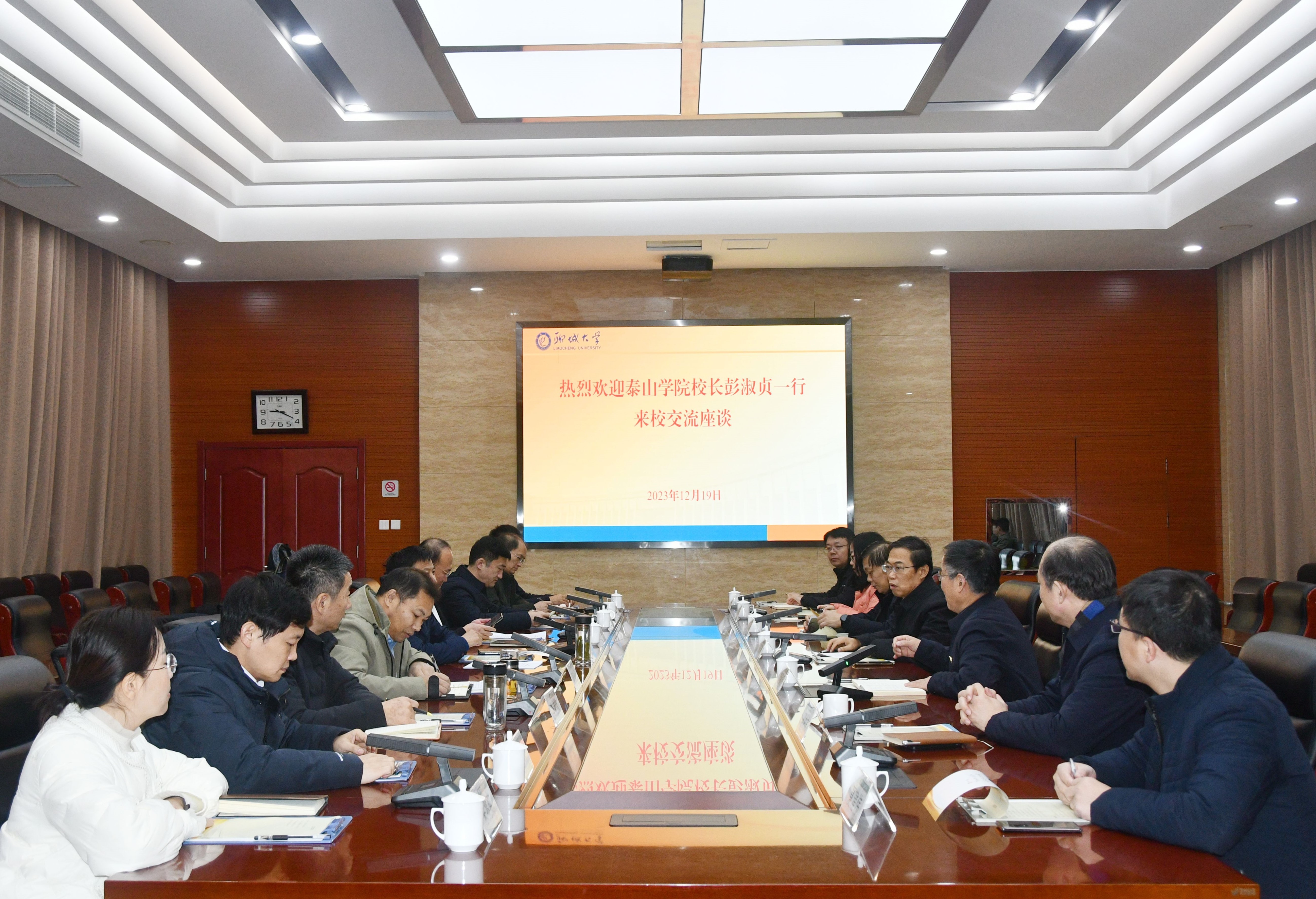 12月19日,泰山学院党委副书记、院长彭淑贞一行来今年会调研,校党委书记关延平,校党委副书记、校长王昭风,校党委副书记胡海泉与客人座谈交流。
