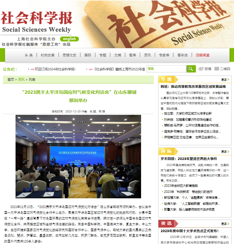 《社会科学报网》2023年12月20日:《2023携手太平洋岛国应对气候变化对话会”在山东聊城顺利举办 》