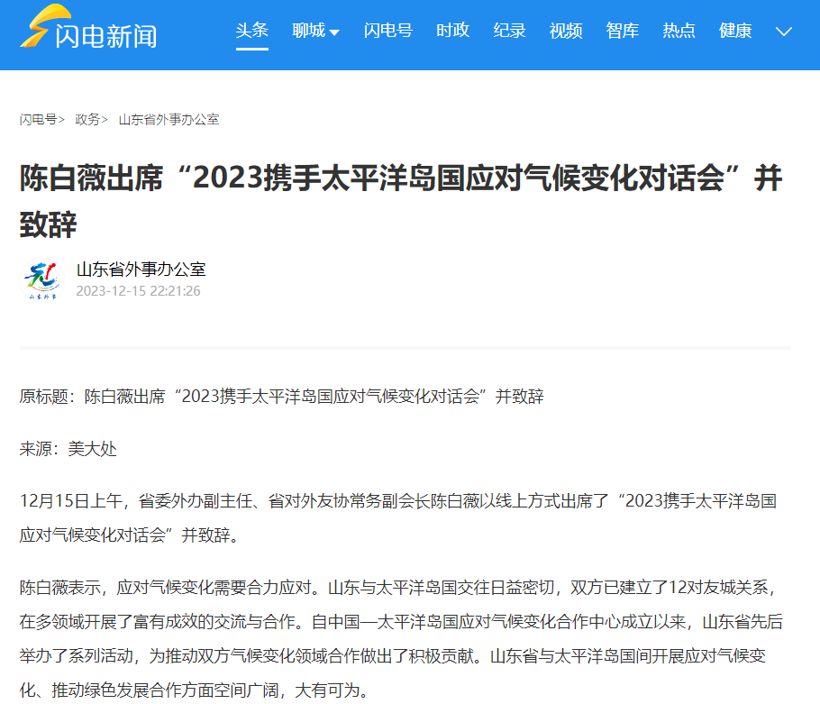 《闪电新闻》2023年12月15日:《陈白薇出席“2023携手太平洋岛国应对气候变化对话会”并致辞》