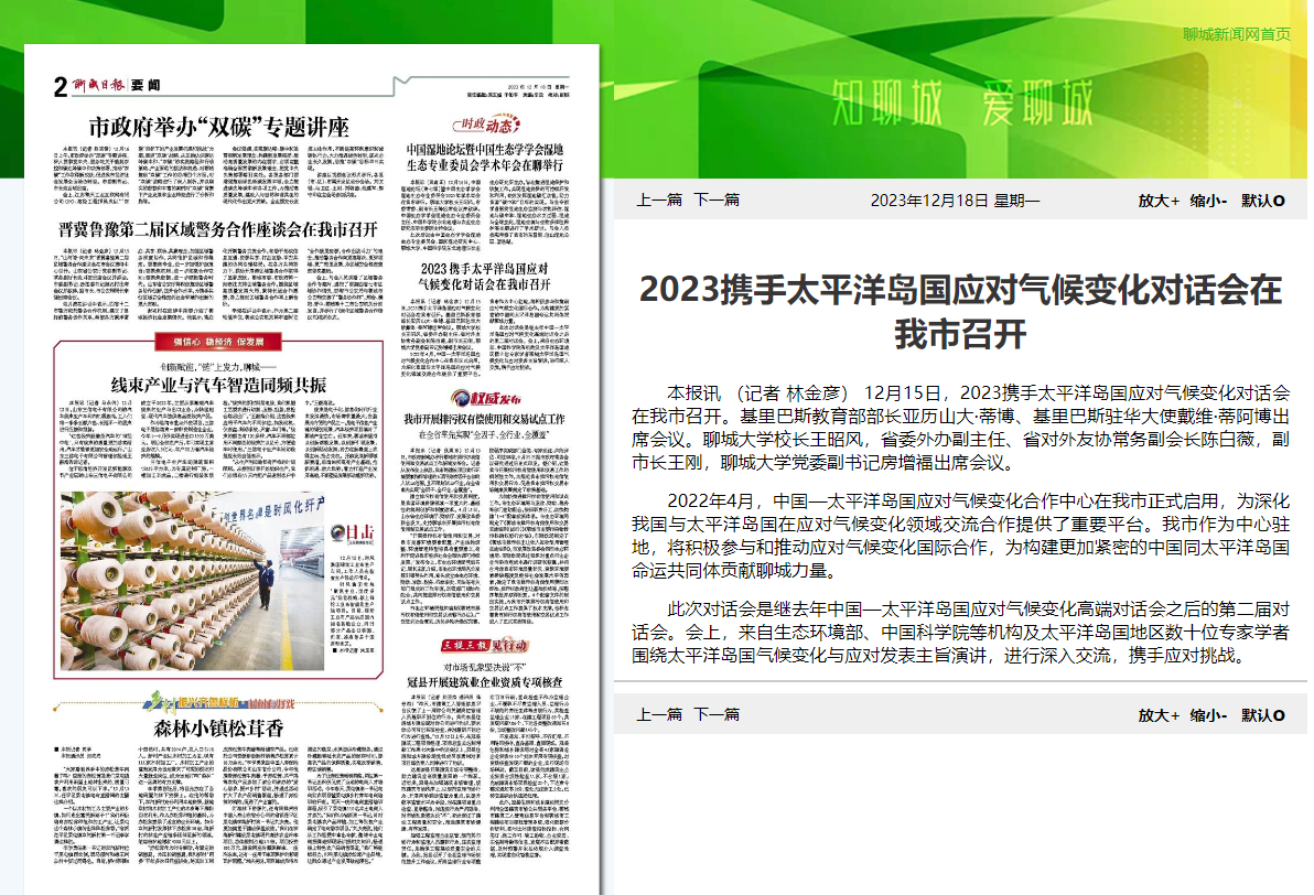 《聊城日报》2023年12月16日第2版:《2023携手太平洋岛国应对气候变化对话会在我市召开》