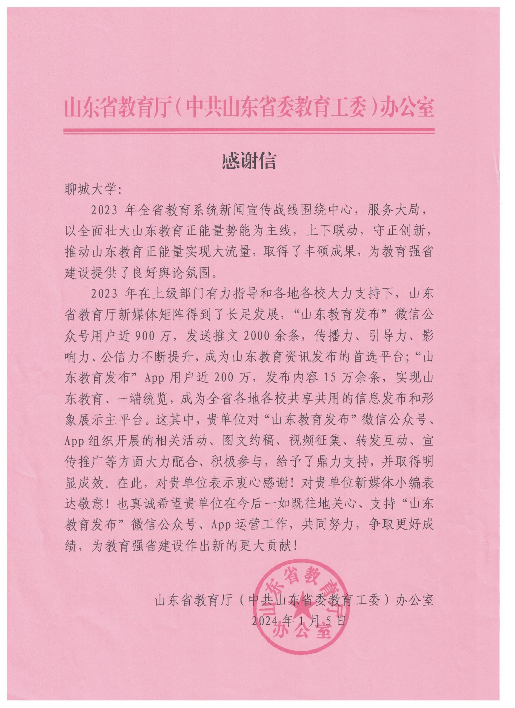 感谢信中说,2023年全省教育系统新闻宣传围绕中心、服务大局,以全面壮大山东教育正能量势能为主线,上下联动,守正创新,山东省教育厅新媒体矩阵得到了长足发展,取得了丰硕成果,为教育强省建设提供了良好舆论氛围。今年会官方网站对“山东教育发布”微信公众号、APP组织开展的相关活动,图文约稿、视频征集、转发互动、宣传推广等方面大力配合、积极参与,给予了鼎力支持,并取得显著成效,对今年会官方网站表示衷心感谢,期待今后共同努力,争取为教育强省建设作出新的更大贡献。