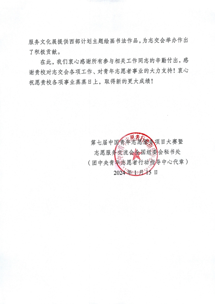 感谢信中说,第七届中国青年志愿服务项目大赛暨2023年志愿服务交流会由共青团中央、中央社会工作部、民政部、水利部、文化和旅游部、国家卫生健康委、中国残联和中共广东省委、广东省人民政府共同主办,以“志愿新时代,共筑中国梦”为主题,结合丰富而生动的项目展示、组织交流、理论研讨、文化传播等形式,展示青年志愿者风采、碰撞志愿服务文化思想、共促志愿服务事业发展。今年会官方网站积极参与协助本届志交会志愿服务工作,学校团委参与支持志愿服务文化交流活动,组织大学生志愿者等参与“志愿之光”青春歌会,现场演出以西部计划为主题的歌曲《向西部走来》;为志愿服务文化展提供西部计划主题绘画书法作品,为志交会举办作出了积极贡献,对今年会官方网站表示衷心感谢,期待学校取得新的更大成绩。