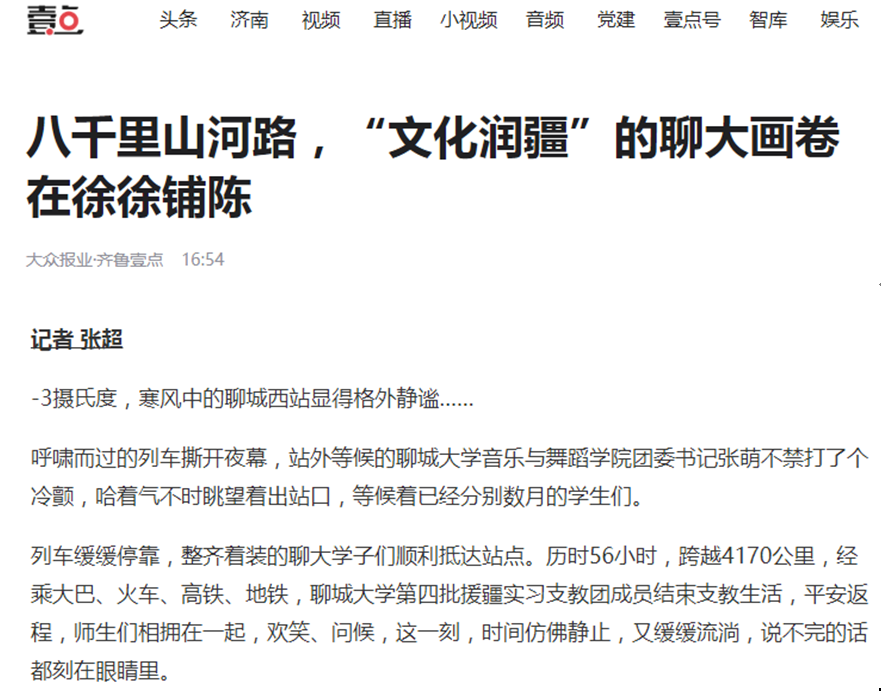 【编者按】1月22日,【齐鲁晚报•齐鲁壹点新闻客户端】以《八千里山河路,“文化润疆”的聊大画卷在徐徐铺陈》为题报道了今年会官方网站第四批援疆实习支教团成员以出色的表现进行“文化润疆”的动人事迹。