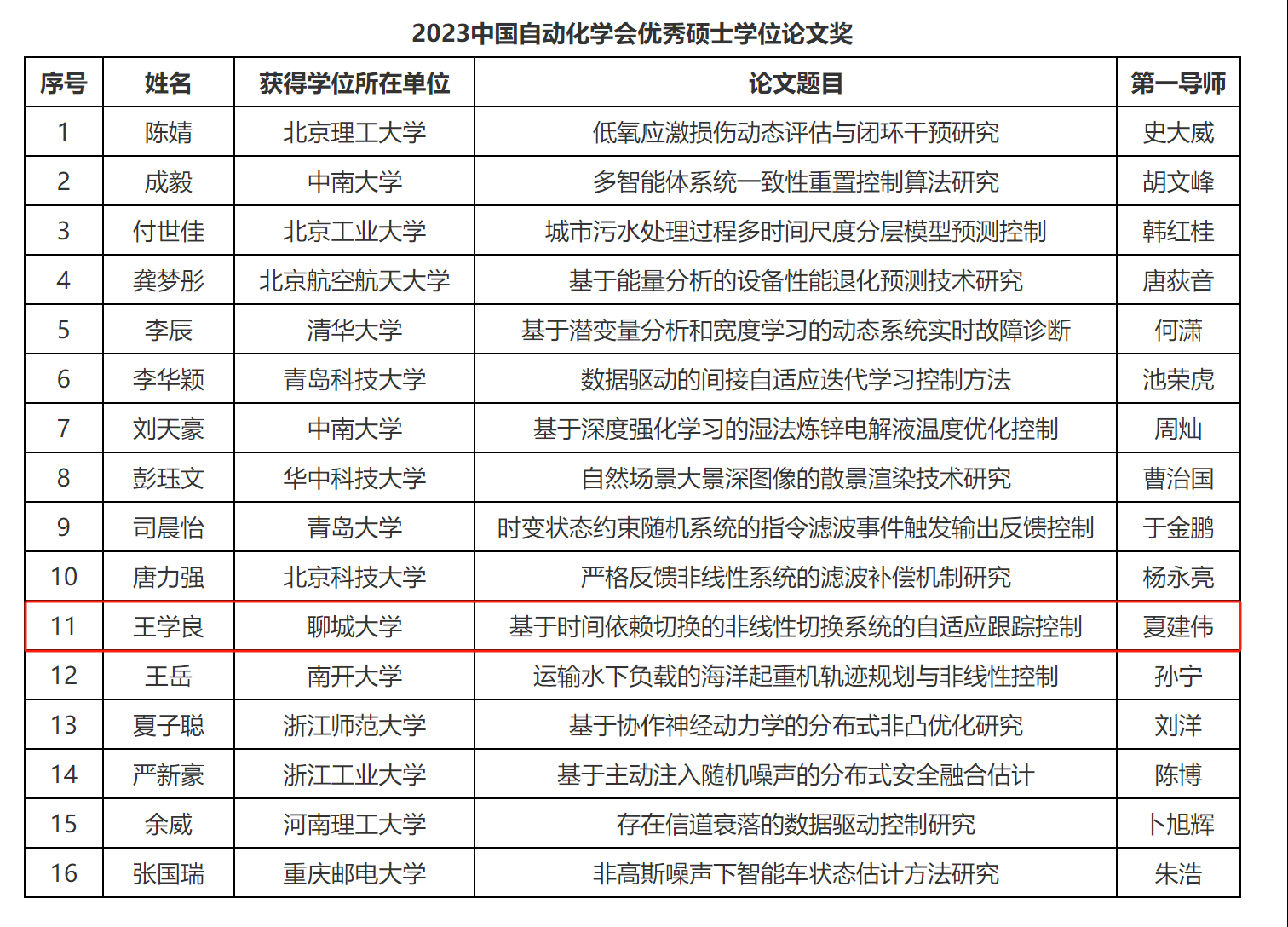 聊大学子王学良获“2023中国自动化学会优秀硕士学位论文奖”