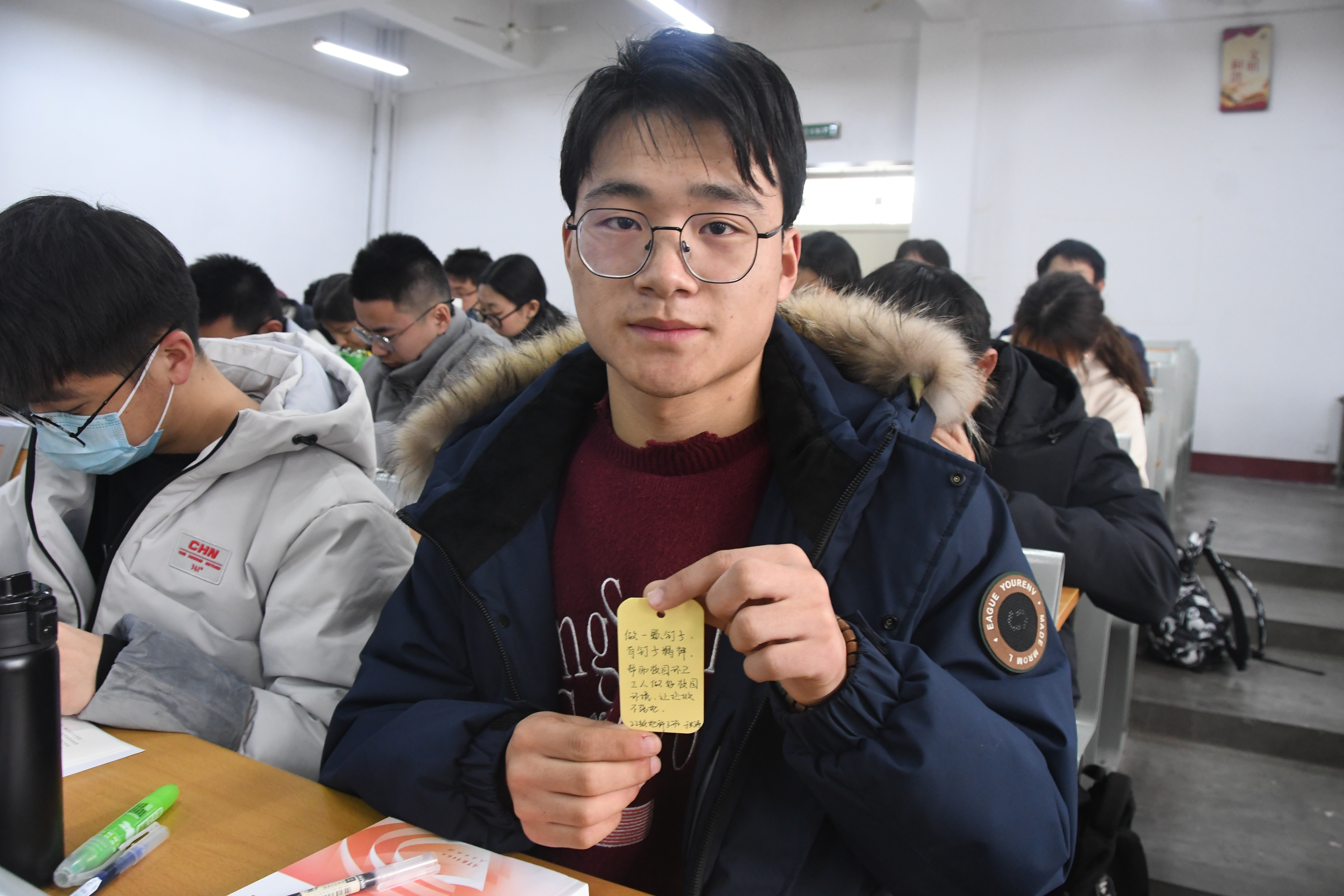 2022级于兴涛同学在心愿卡上写道:做一颗钉子,有钉子精神。潘士平同学写道:在日常学习中,帮助基础薄弱的同学提升成绩,在日常生活中,力所能及地帮助同学和舍友,把雷锋精神融入日常的每一天。