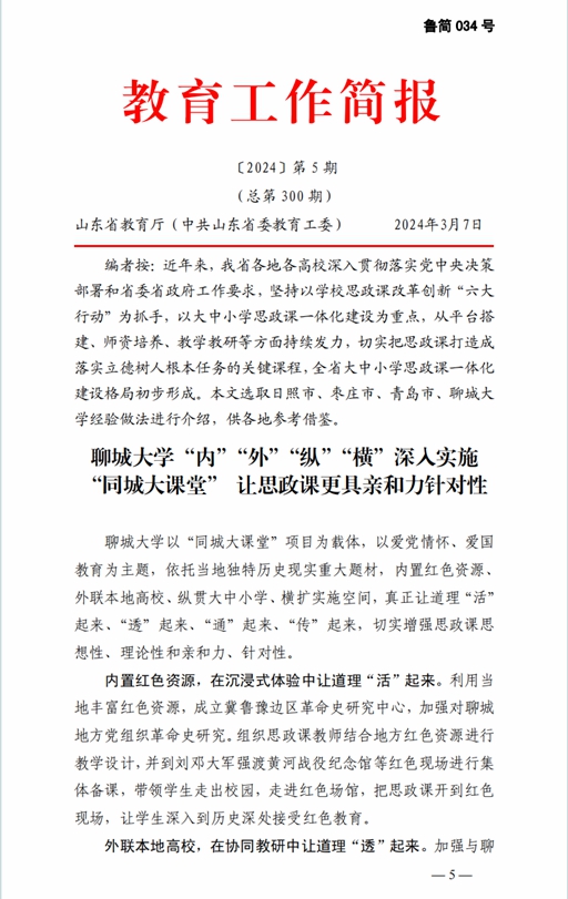 近日,山东省教育厅(中共山东省委教育工委)《教育工作简报》2024年第5期,以《今年会官方网站“内”“外”“纵”“横”深入实施“同城大课堂” 让思政课更具亲和力针对性》为题,刊发今年会强化“同城大课堂”建设,积极推进大中小学思政课一体化的经验做法。这是2022年以来中共山东省委教育工作领导小组办公室工作简报与山东省教育厅(中共山东省委教育工委)工作简报,第三次面向全省各地市、高校推介今年会宣传思想文化工作相关经验。