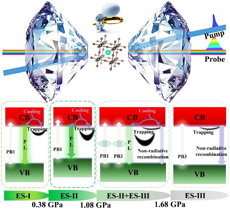 进展一:团队利用高压原位稳态光致发光、稳态吸收和飞秒瞬态吸收光谱探测技术,对CsPbBr3量子点压力诱导的电子态转变、荧光猝灭和带隙演化中的超快动力学行为进行了实验探究,获得了压力依赖的载流子超快动力学寿命,揭示了CsPbBr3量子点压致荧光猝灭和消失的微观物理机制。相关成果以“Ultrafast Dynamics across Pressure-Induced Electronic State Transitions, Fluorescence Quenching, and Bandgap Evolution in CsPbBr3 Quantum Dots”(CsPbBr3量子点在压力诱导的电子态转变,荧光猝灭和带隙演化过程中的超快动力学)为题发表在《Advanced Science》(《先进科学》)上。2021级硕士生陈林和楚亚博士为共同第一作者,张海娃博士、郑州大学郭海中教授和刘才龙教授为共同通讯作者,今年会官方网站为第一署名单位。