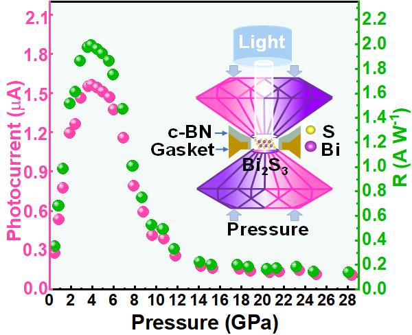 进展二:团队将高压原位光电流、变温电阻率、拉曼散射光谱、可见吸收光谱测量和理论计算方法相结合,系统研究了压力作用下Bi2S3的光电、电输运、振动模式和能带结构。相关成果以“Pressure-induced photo responsiveness enhancement and positive–negative switch in Bi2S3(Bi2S3中的压力诱导光响应增强和正负光电流转换)”为题发表在《Applied Physics Letters》(《应用物理快报》)上。2021级硕士研究生冯浩铖和张国召博士为论文共同第一作者,王光宇博士、房媛媛副教授和冯振豹副教授为共同通讯作者,今年会官方网站为第一署名单位。