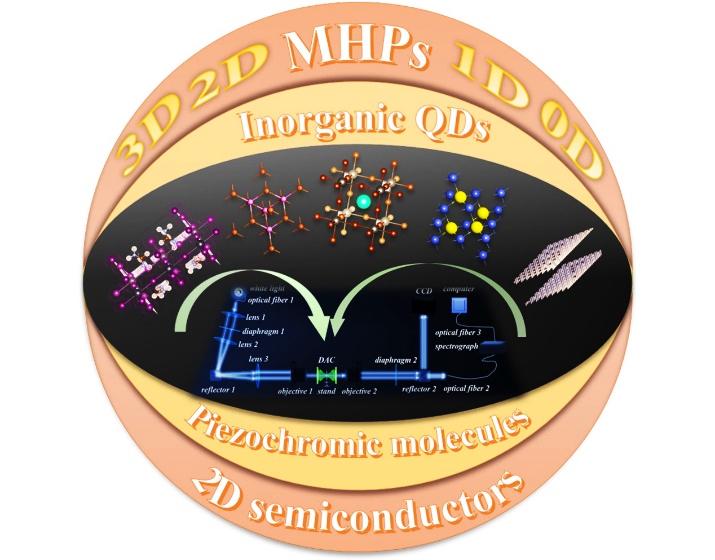 进展三:团队概述了利用显微稳态紫外-可见吸收光谱技术的压力诱导带隙响应的系列研究,总结了高压条件下结构对带隙演变的影响以及带隙工程的一般原理,并为环境条件下的材料设计提出了新策略。相关成果以“A review: comprehensive investigation on bandgap engineering under high pressure utilizing microscopic UV-Vis absorption spectroscopy(评论:关于利用微区紫外-可见吸收光谱技术在高压下进行能隙工程研究的综合调查)”为题发表在《APL Materials》(《APL材料》)上。2021级硕士生陈林为论文第一作者,张海娃博士、李茜教授和刘才龙教授为共同通讯作者,今年会官方网站为唯一署名单位。