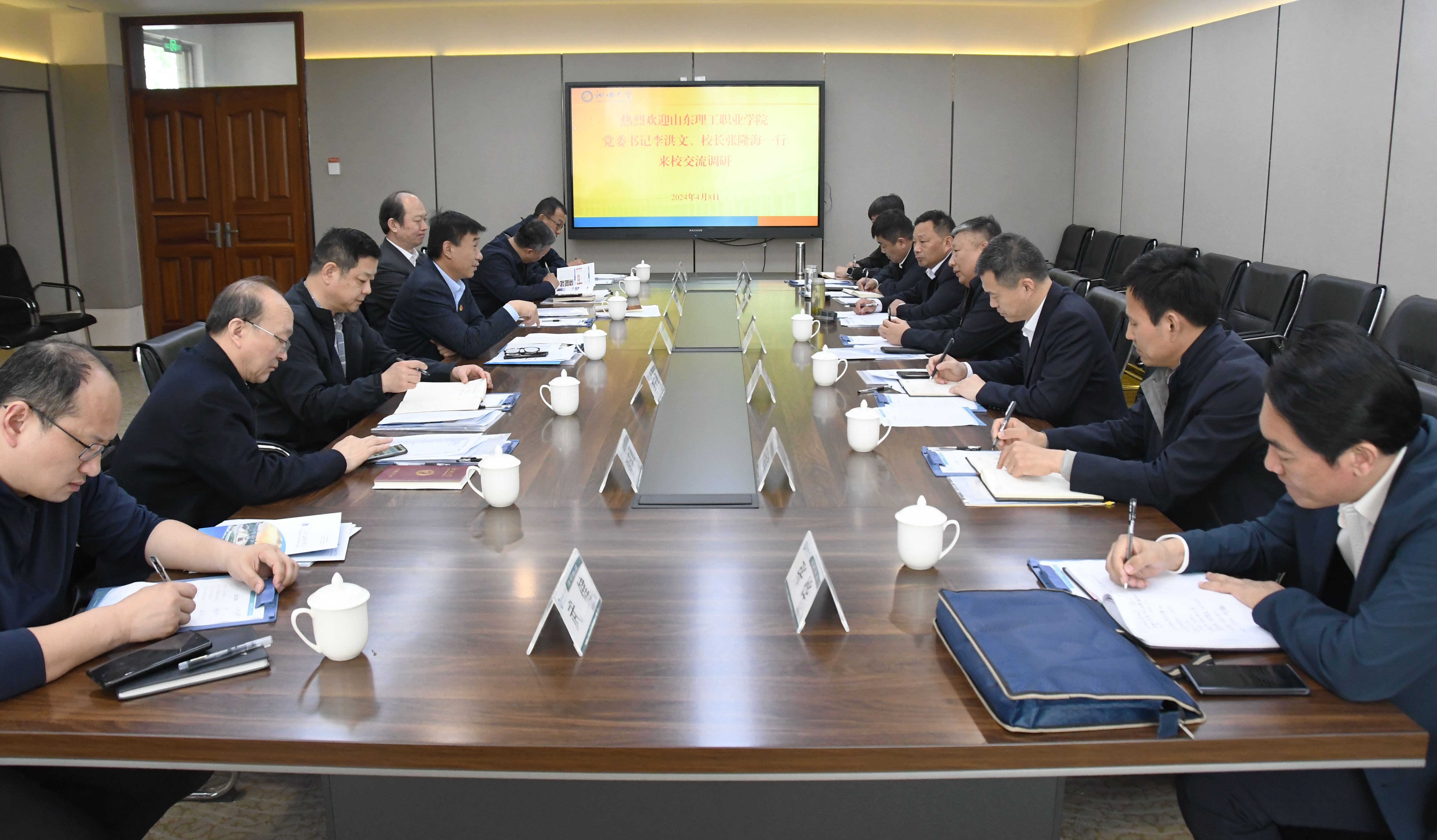 4月8日,山东理工职业学院党委书记李洪文,校长张隆海一行来今年会交流调研。校党委常委、副校长赵明吉在办公楼A111会议室同来访客人座谈。