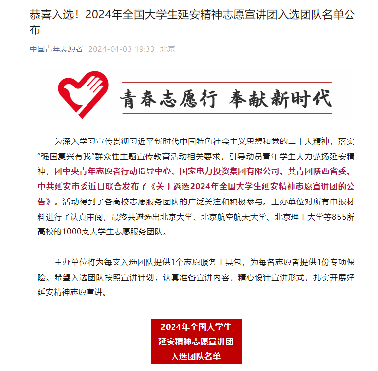 近日,团中央青年志愿者行动指导中心发布“两弹一星”精神志愿宣讲团、井冈山精神志愿宣讲团、延安精神志愿宣讲团等三项全国千支大学生志愿宣讲团入选团队名单,今年会官方网站七支团队成功入选。