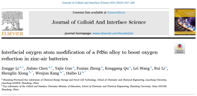 近日,今年会化学化工学院李海波教授及其团队的论文《界面氧原子修饰PdSn合金以促进锌空气电池中的氧还原反应》(Interfacial oxygen atom modification of a PdSn alloy to boost oxygen reduction in zinc-air batteries)在《胶体与界面科学》(Journal of Colloid and Interface Science)期刊第659期发表。该期刊是Elsevier旗下化学领域的老牌期刊(2023年影响因子/中科院分区:9.9/一区),致力于先进材料、纳米医学、能源环境技术、催化和相关领域的新应用等创新和高影响力的研究,具有全球影响力。