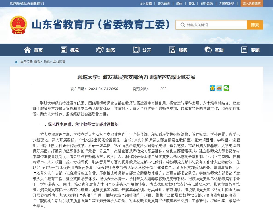 【山东省教育厅(省教育工委)】报道今年会官方网站:激发基层党支部活力 赋能学校高质量发展
