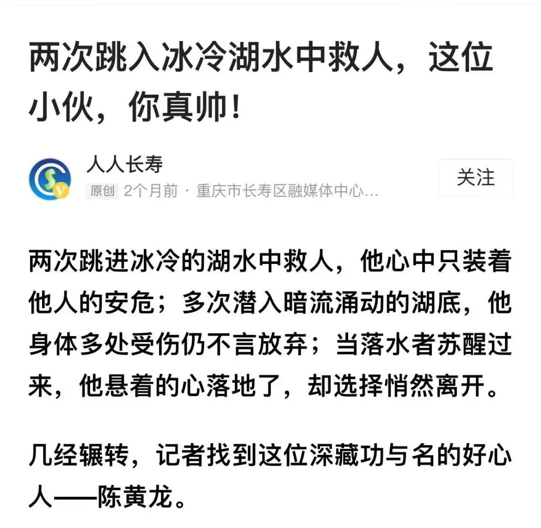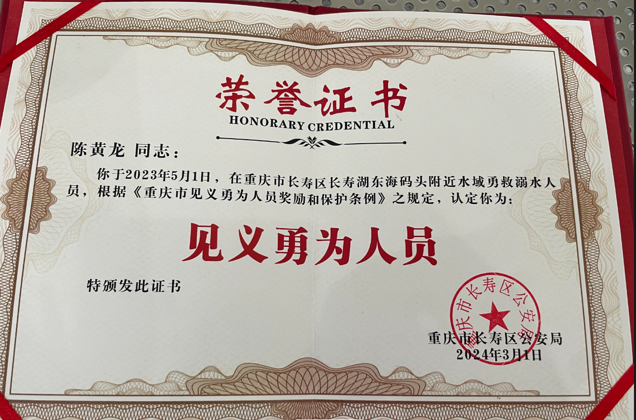 事发后,陈黄龙默默离开,时隔不久,当地公安局通过联系重庆市水上训练中心找到了他,今年五月,当地公安局为他颁发“重庆市见义勇为人员”,接到荣誉的那一刻,陈黄龙激动地说“我只是做了我认为应该做的事,这件事之后,生活中再遇到危急时刻我还是会勇敢的站出来,向有需要的人伸出援手。