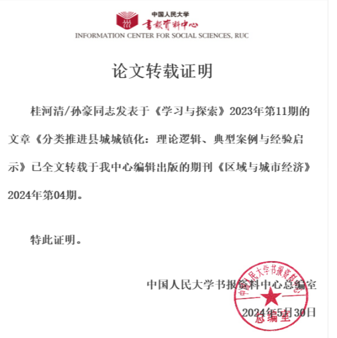 近日,商学院教师桂河清发表在《学习与探索》2023年第11期上的一作论文《分类推进县城城镇化:理论逻辑、典型案例与经验启示》被人大复印《区域与城市经济》2024年04期全文转载。