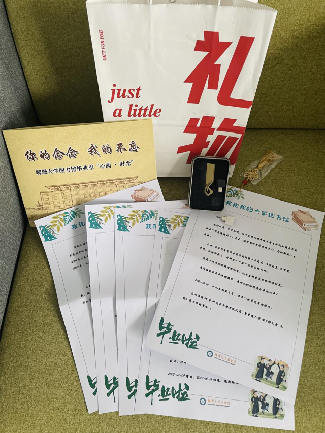 “礼物”记载的是毕业生大学四年徜徉书海的阅读时光,一封信、一个优盘、一个纸袋,一篇文字、一曲音乐、一个视频,立体生动地展现着四年的借阅档案和与图书馆邂逅、相知的读书故事,每一份都是个人专属,每一份都是独一无二。