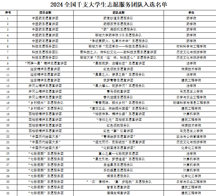 2024年全国千支大学生志愿服务团队遴选工作启动以来,学校高度重视、科学谋划,校团委积极开展项目宣传、团队组建、遴选推报工作。经学院团委申报,校团委遴选推荐,由十二个学院团委推荐的32支团队成功入选。入选的志愿服务团队将在六月至十一月深入基层社区、农村广泛开展中医药知识宣讲、“两弹一星”精神宣讲、延安精神宣讲、井冈山精神宣讲以及“乡村振兴”“七彩假期”等志愿服务活动。