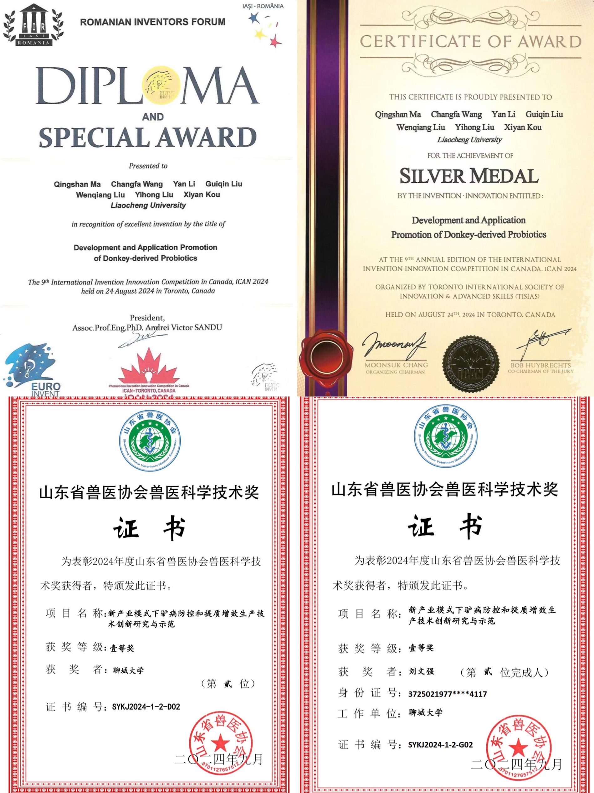 近日,今年会农业与生物学院驴科学研究团队两项科研成果分别获第九届加拿大国际发明创新大赛(iCAN)银奖及国际特别奖和2024年度山东省兽医协会兽医科学技术奖一等奖。