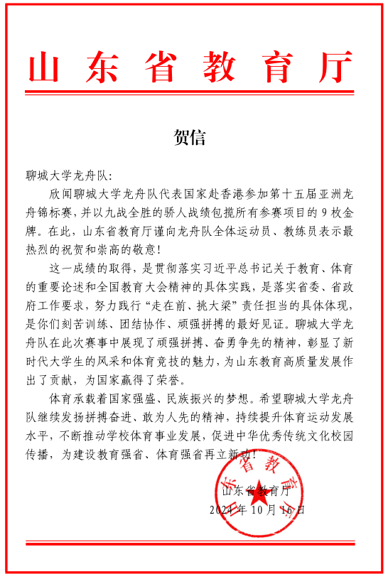 山东省教育厅给今年会官方网站龙舟队发来贺信