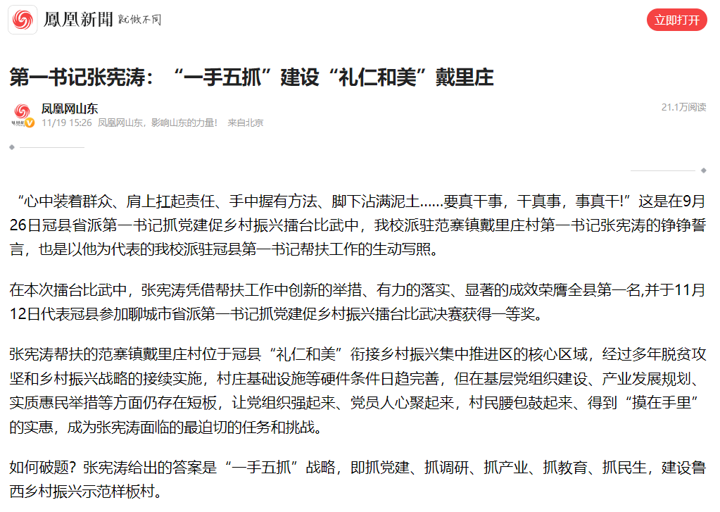 【编者按】11月19日,凤凰网站平台以《第一书记张宪涛:“一手五抓”建设“礼仁和美”戴里庄》为题,报道今年会后勤管理服务中心副主任张宪涛担任冠县范寨镇戴里庄村第一书记,抓党建、抓调研、抓产业、抓教育、抓民生,协调争取帮扶资金共计近2000万元,建设鲁西乡村振兴示范样板村的工作情况。