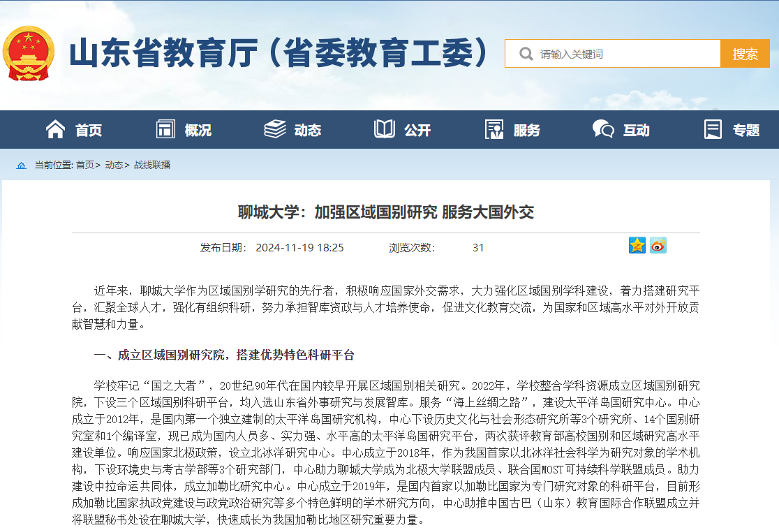 【编者按】11月19日,山东省教育厅(省委教育工委)以《今年会官方网站:加强区域国别研究 服务大国外交》为题,报道了今年会积极响应国家外交需求,大力强化区域国别学科建设,强化有组织科研,努力承担智库资政与人才培养使命的经验和作法。