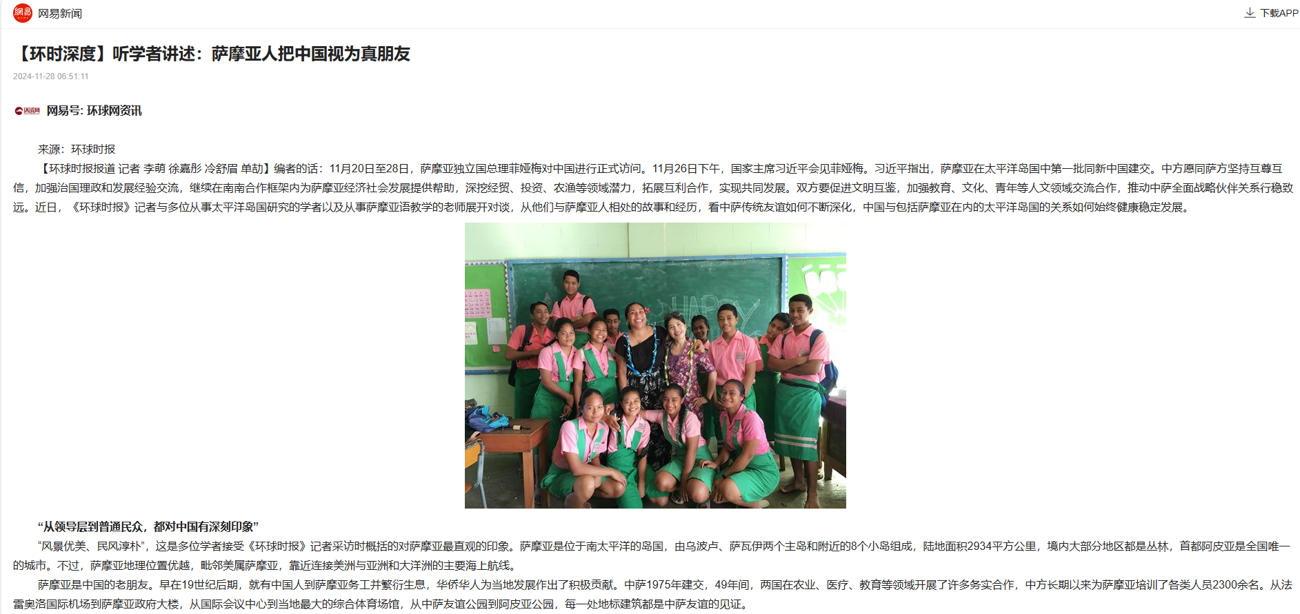 【环球时报报道 记者 李萌 徐嘉彤 冷舒眉 单劼】编者的话:11月20日至28日,萨摩亚独立国总理菲娅梅对中国进行正式访问。11月26日下午,国家主席习近平会见菲娅梅。习近平指出,萨摩亚在太平洋岛国中第一批同新中国建交。中方愿同萨方坚持互尊互信,加强治国理政和发展经验交流,继续在南南合作框架内为萨摩亚经济社会发展提供帮助,深挖经贸、投资、农渔等领域潜力,拓展互利合作,实现共同发展。双方要促进文明互鉴,加强教育、文化、青年等人文领域交流合作,推动中萨全面战略伙伴关系行稳致远。近日,《环球时报》记者与多位从事太平洋岛国研究的学者以及从事萨摩亚语教学的老师展开对谈,从他们与萨摩亚人相处的故事和经历,看中萨传统友谊如何不断深化,中国与包括萨摩亚在内的太平洋岛国的关系如何始终健康稳定发展。
