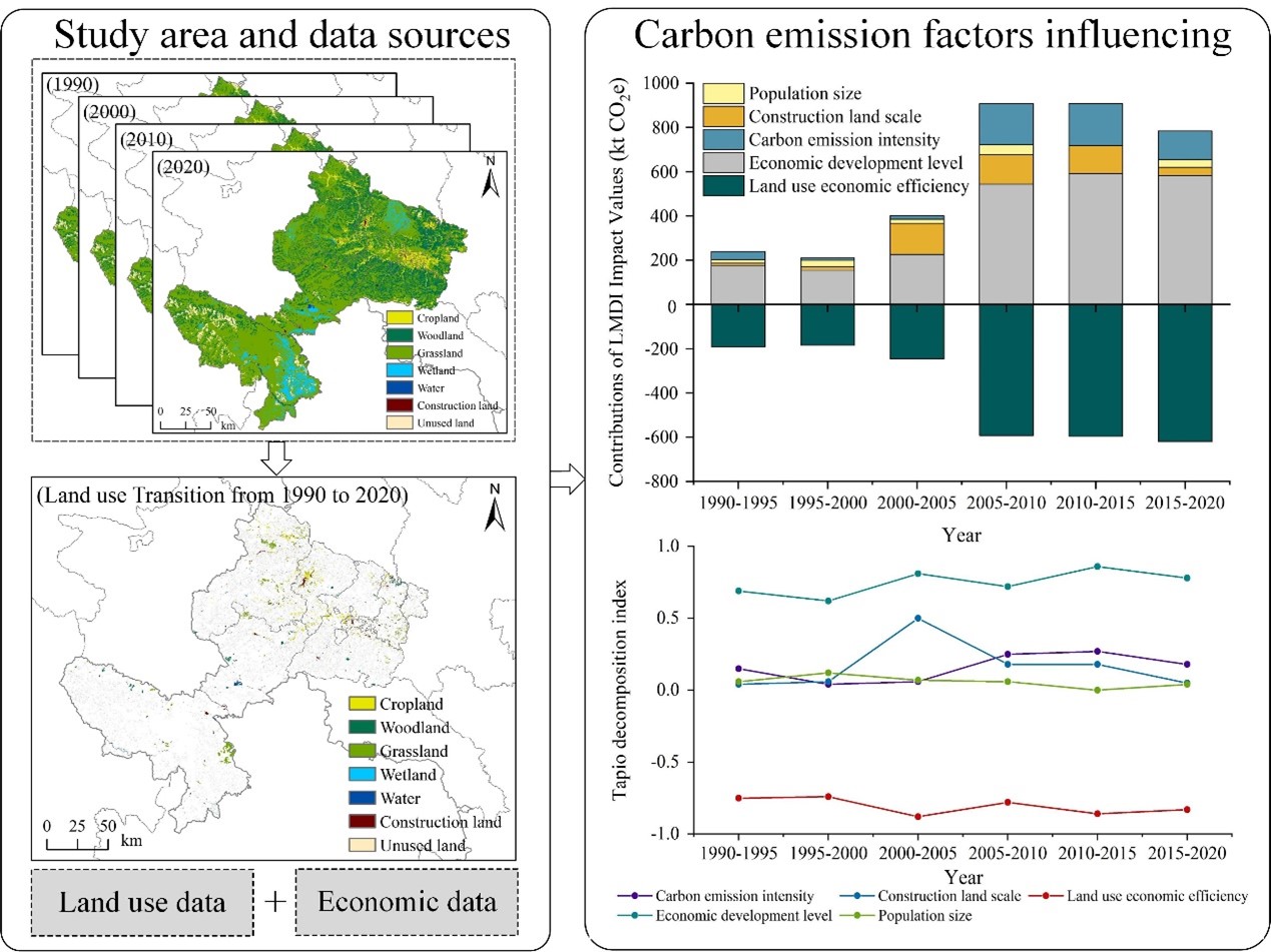 高寒草甸广泛分布于山区高原等气候条件恶劣的地区,对气候变化和人类活动具有较高的敏感性。甘南黄河上游位于青藏高原,是世界重要的高寒草甸区域之一。与此同时,该地区生态环境较为脆弱,土地利用引起的碳排放问题尤为突出,且影响该土地利用碳排放变化因素复杂。本研究以甘南黄河上游地区为研究对象,采用LMDI分解模型和Tapio脱钩模型分析了土地利用碳排放的主要驱动因素,并探讨了这些因素与经济增长之间的相关性。研究结果表明,建设用地已成为碳排放的主要来源。随着建设用地碳排放强度的增加以及建设用地面积的扩展,土地利用碳排放也随之上升。同时,土地利用经济效率显著提升,对碳排放的增长起到了抑制作用。研究还发现,经济发展与土地利用碳排放之间呈现出弱脱钩关系。本研究为全球高寒草甸地区在应对气候变化,实现高寒草甸地区的可持续发展方面提供科学依据。