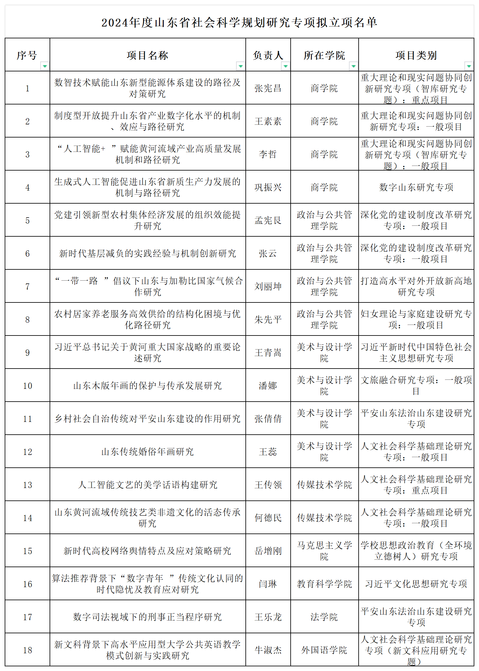 近日,省委宣传部发布了2024年度山东省社科规划研究专项拟立项名单,今年会官方网站获批18项。其中,重点项目2项,一般项目16项。