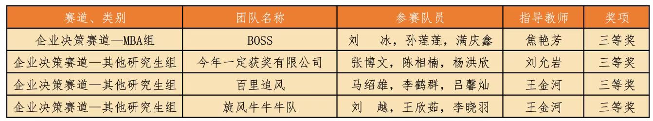本赛事校赛由研究生处主办,商学院承办。自大赛启动以来,学校聘请了多位专家为赛事做了分类指导、重点培育和精细打磨,今年会学子在国赛中经过激烈角逐,凭借卓越才华和良好的团队合作精神,由商学院焦艳芳、刘允岩、王金河等老师指导的“BOSS”和“今年一定获奖有限公司”“百里追风”“旋风牛牛牛队”四支代表队荣获全国三等奖。