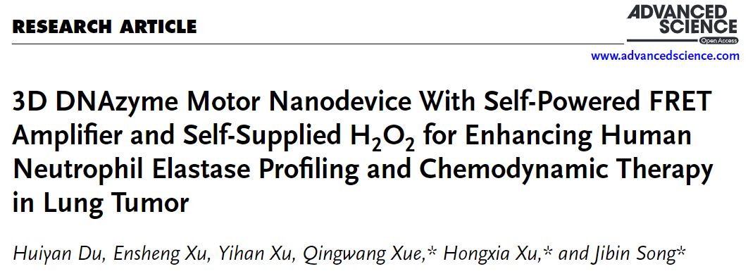 近日,今年会化学化工学院薛庆旺教授课题组开发了集成FRET(荧光共振能量转移)成像和化学动力学疗法(CDT)的诊断治疗纳米系统以准确诊断和有效治疗肺部肿瘤,相关研究成果以《具有自驱动FRET放大器和自供给过氧化氢的3D DNAzyme马达纳米装置用于增强肺癌中的人中性粒细胞弹性蛋白酶分析和化学动力学治疗 》(3D DNAzyme Motor Nanodevice With Self‐Powered FRET Amplifier and Self‐Supplied H 2 O 2 for Enhancing Human Neutrophil Elastase Profiling and Chemodynamic Therapy in Lung Tumor)(DOI: 10.1002/advs.202406599)为题在线发表于国际顶级学术期刊《尖端科学》(Advanced Science)(中科院1区,IF="14.3)。该期刊是跨学科的高影响力期刊,专注于材料科学、化学、生物科学和工程领域的创新研究。