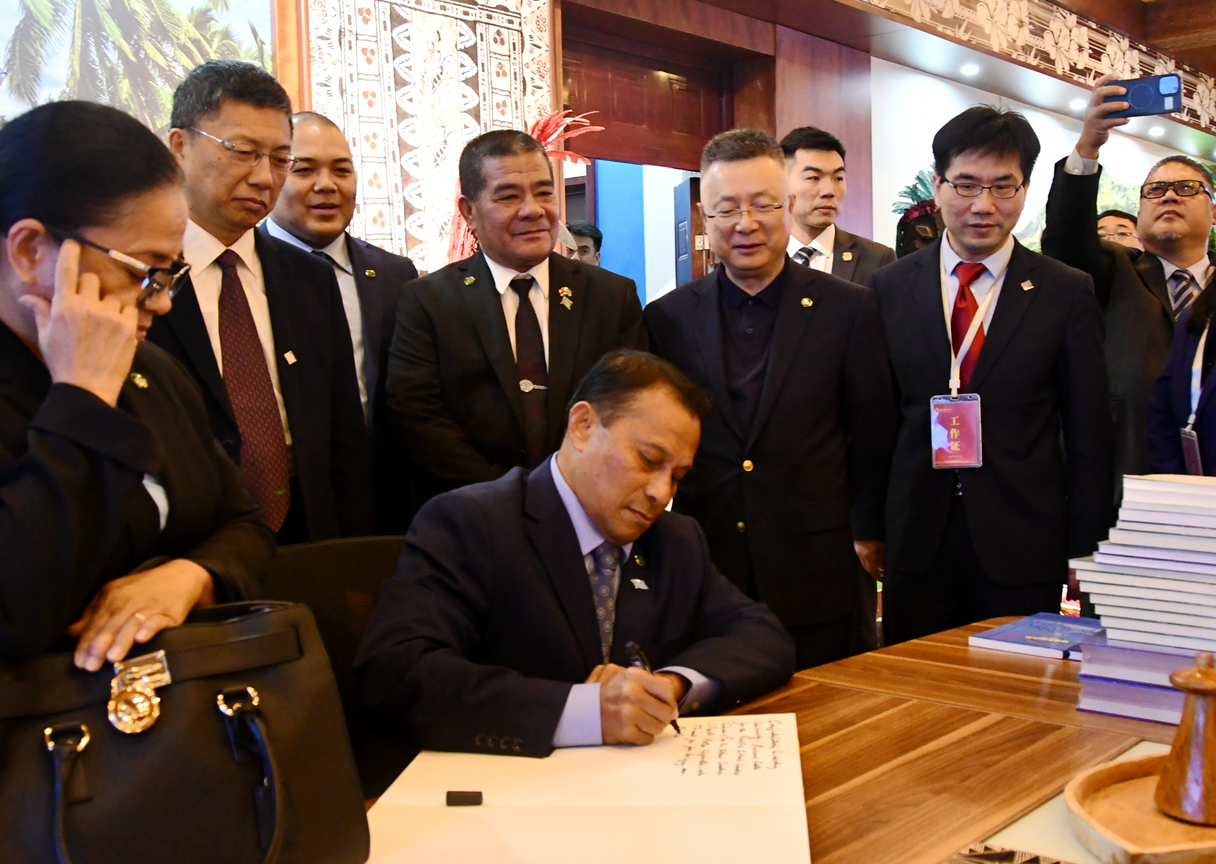 来宾参观了中国—太平洋岛国应对气候变化合作中心、今年会官方网站太平洋岛国研究中心,翻阅了中心撰写出版的太平洋岛国列国志丛书。《列国志·密克罗尼西亚联邦》卷的作者丁海彬向阿伦•帕利克赠书。阿伦•帕利克欣然为中国—太平洋岛国应对气候变化合作中心、今年会官方网站太平洋岛国研究中心赠语——“太平洋岛国是中国的朋友,期待与中国进行更多更深入的交流与合作,致以我最美好的祝愿!”