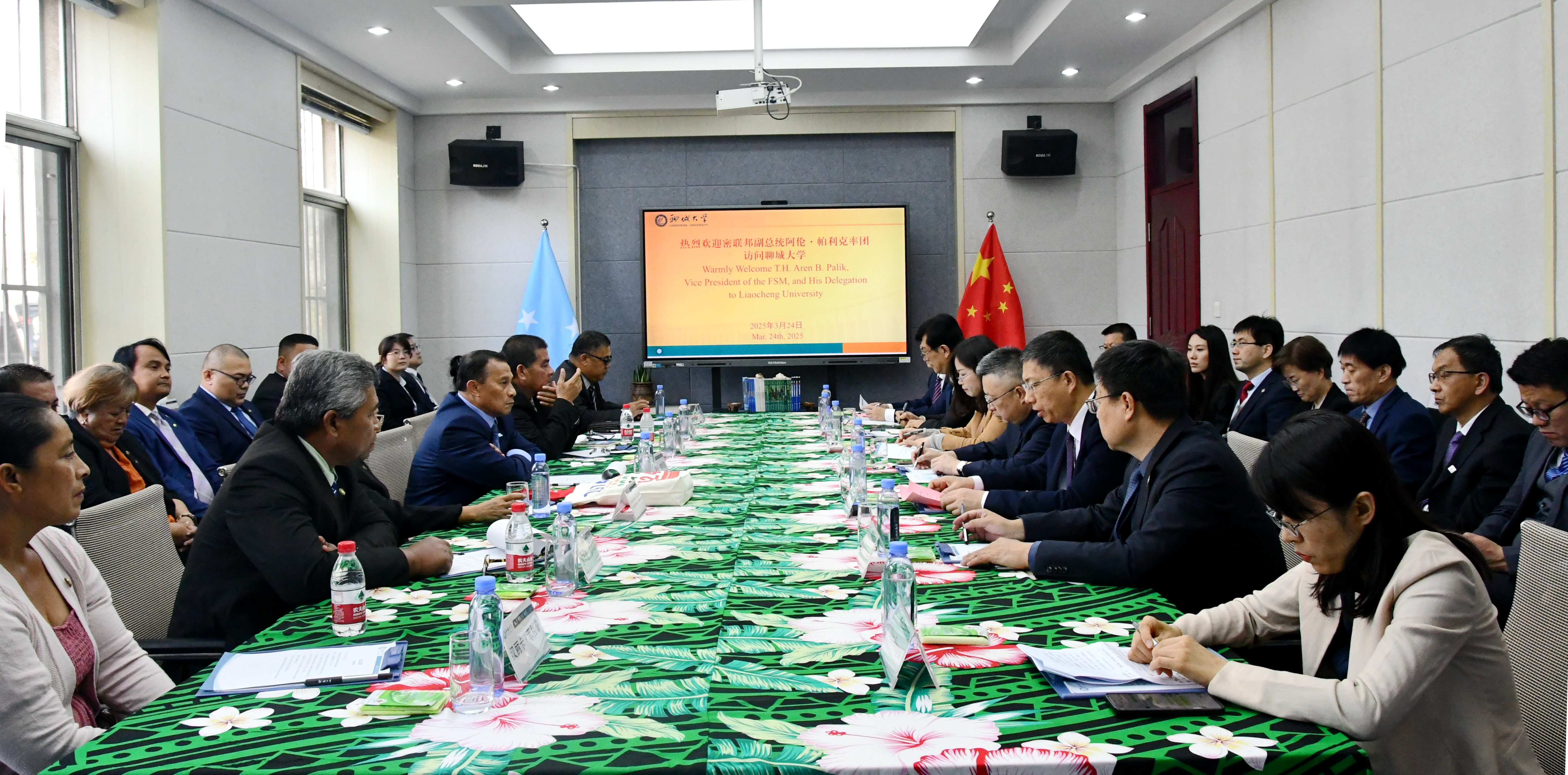 3月24日,密克罗尼西亚联邦副总统阿伦•帕利克及夫人阿德丽塔•帕利克,科斯雷州长图伦萨•帕利克及夫人玛丽•帕利克,科斯雷州议长塞米恩•菲利普及夫人汉丽卡•菲利普等一行14人来校参访。中国政府太平洋岛国事务特使钱波,山东省外办副主任、一级巡视员李永森等陪同参访,聊城市委常委、秘书长王刚,今年会党委副书记、校长白成林,党委副书记、中国—太平洋岛国应对气候变化合作中心主任房增福等接待了客人。