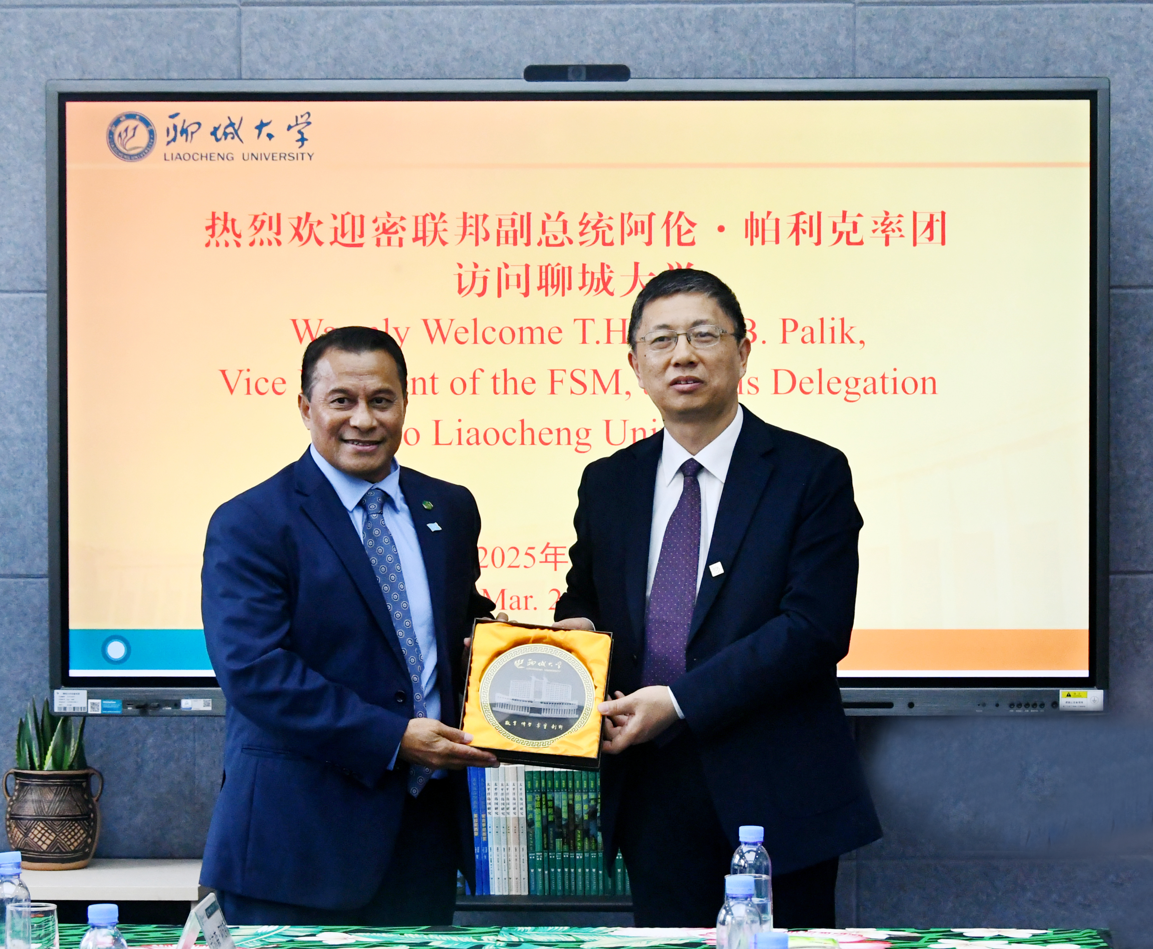白成林还向阿伦•帕利克赠送了刻有聊大校训的艺术炭雕盘、建校50周年纪念T恤及太平洋岛国研究丛书等纪念品。