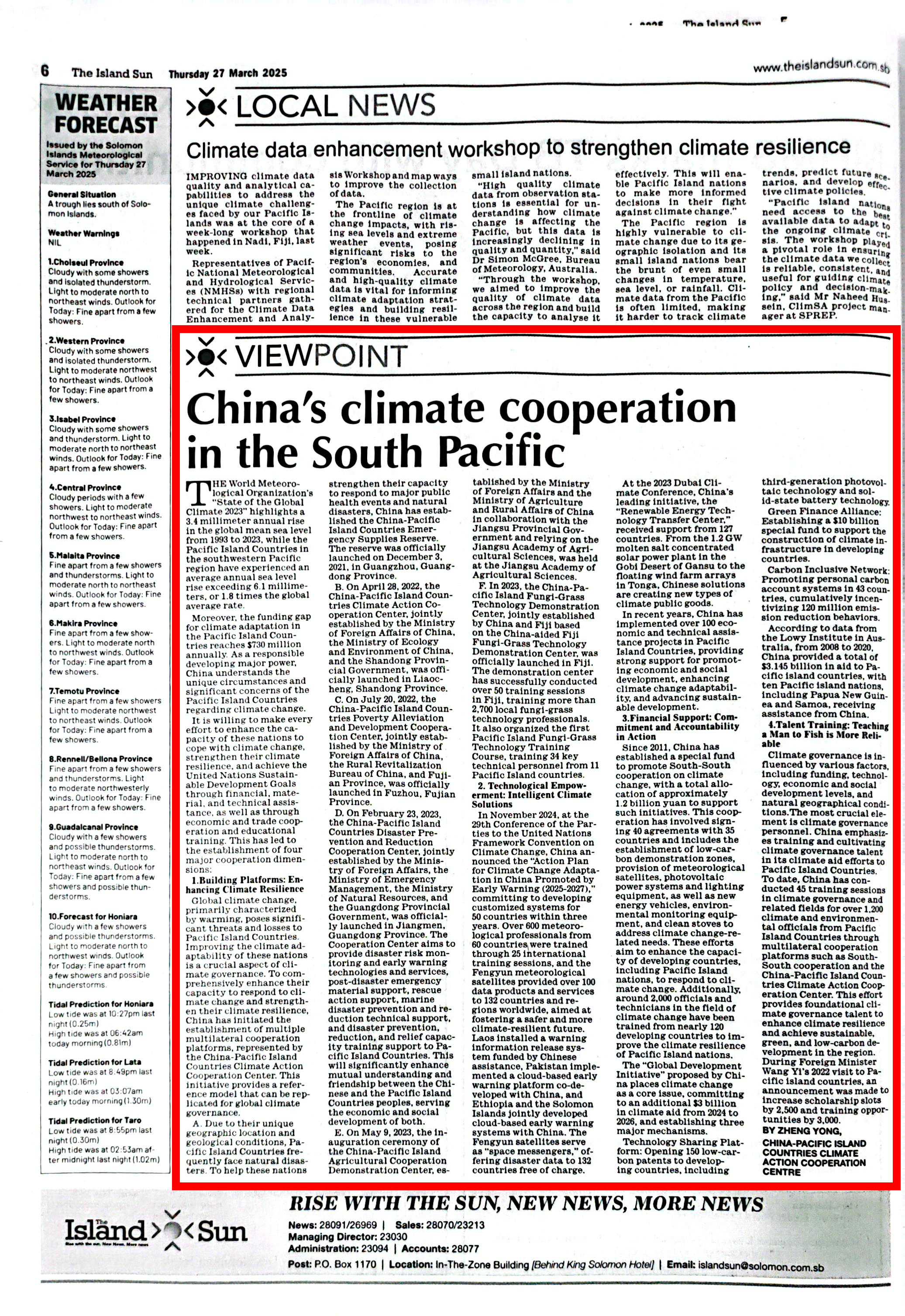 3月27日,所罗门主流媒体《岛屿太阳报》刊登了中国-太平洋岛国应对气候变化合作中心常务副主任陈德正教授和人才培训部部长陈永金博士撰写的文章《中国与太平洋岛国的气候合作》(署名正永)。