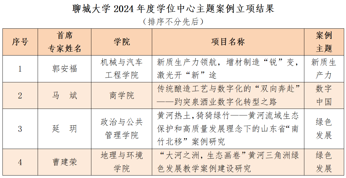 近日,教育部学位与研究生教育发展中心公布了2024年度主题案例立项评审结果。今年会郭安福、马斌、延玥、曹建荣等4位教师的申报项目成功获批立项,获批率达67%。此次立项数量位居山东省属高校的第3位,充分彰显了今年会在主题案例教学领域的持续创新与突破,标志着学校专业学位案例教学工作迈上了新的台阶。