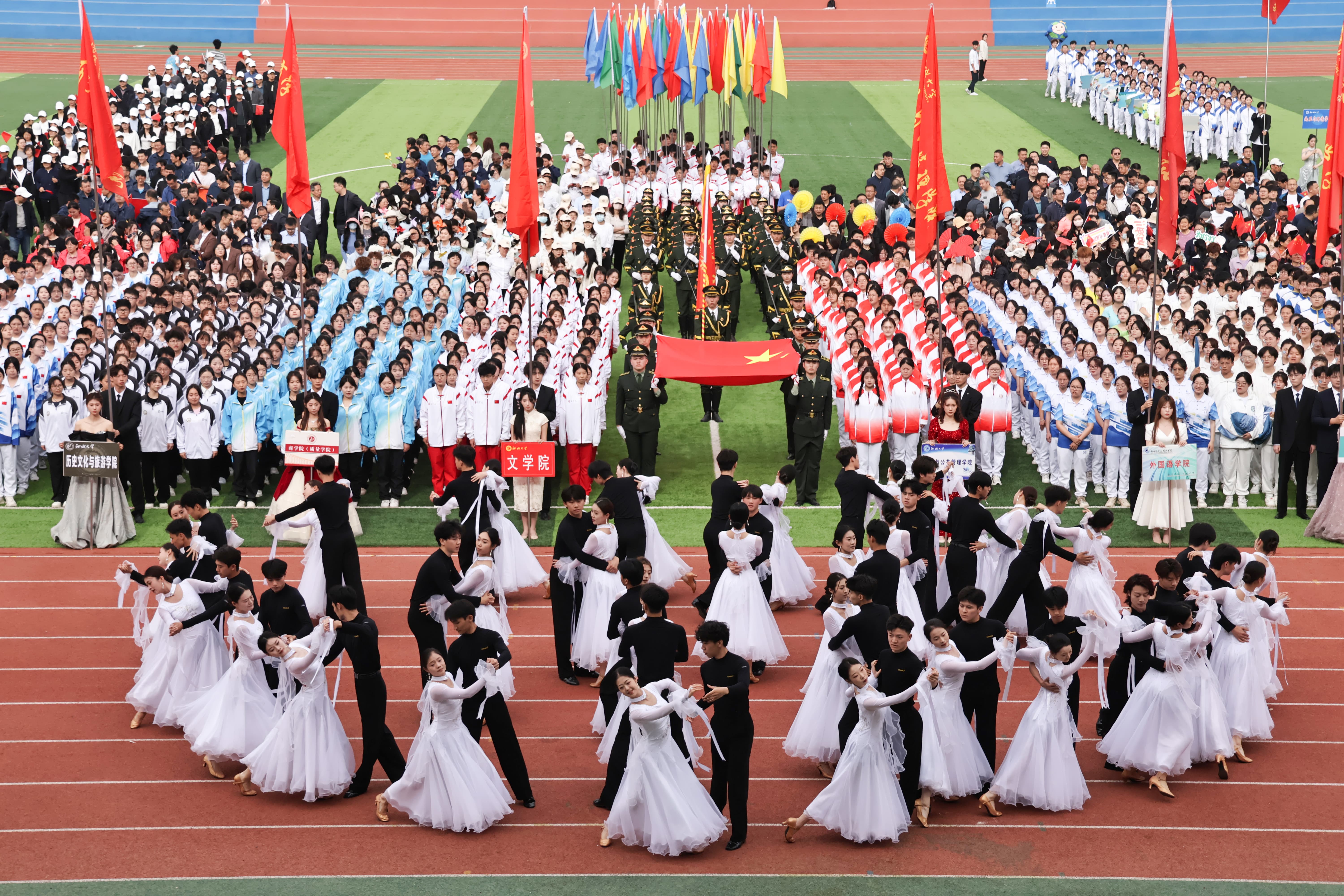 开幕式在激昂的《运动员进行曲》中拉开序幕。各学院方队精神抖擞,服装道具紧扣学院特色与主题,以创意表演诠释学科魅力。文学院声情并茂的黄梅戏表演别具一格,展现传统文化魅力;历史文化与旅游学院演绎岛国风土人情,凸显学科特色;音乐与舞蹈学院学子身姿蹁跹,舞步灵动,一曲交谊舞让全场沸腾;建筑工程学院彩旗武术表演,热血沸腾……每个方队都步伐矫健,口号响亮,充分展现出聊大学子积极向上、团结奋进的精神风貌,赢得现场阵阵欢呼与掌声。