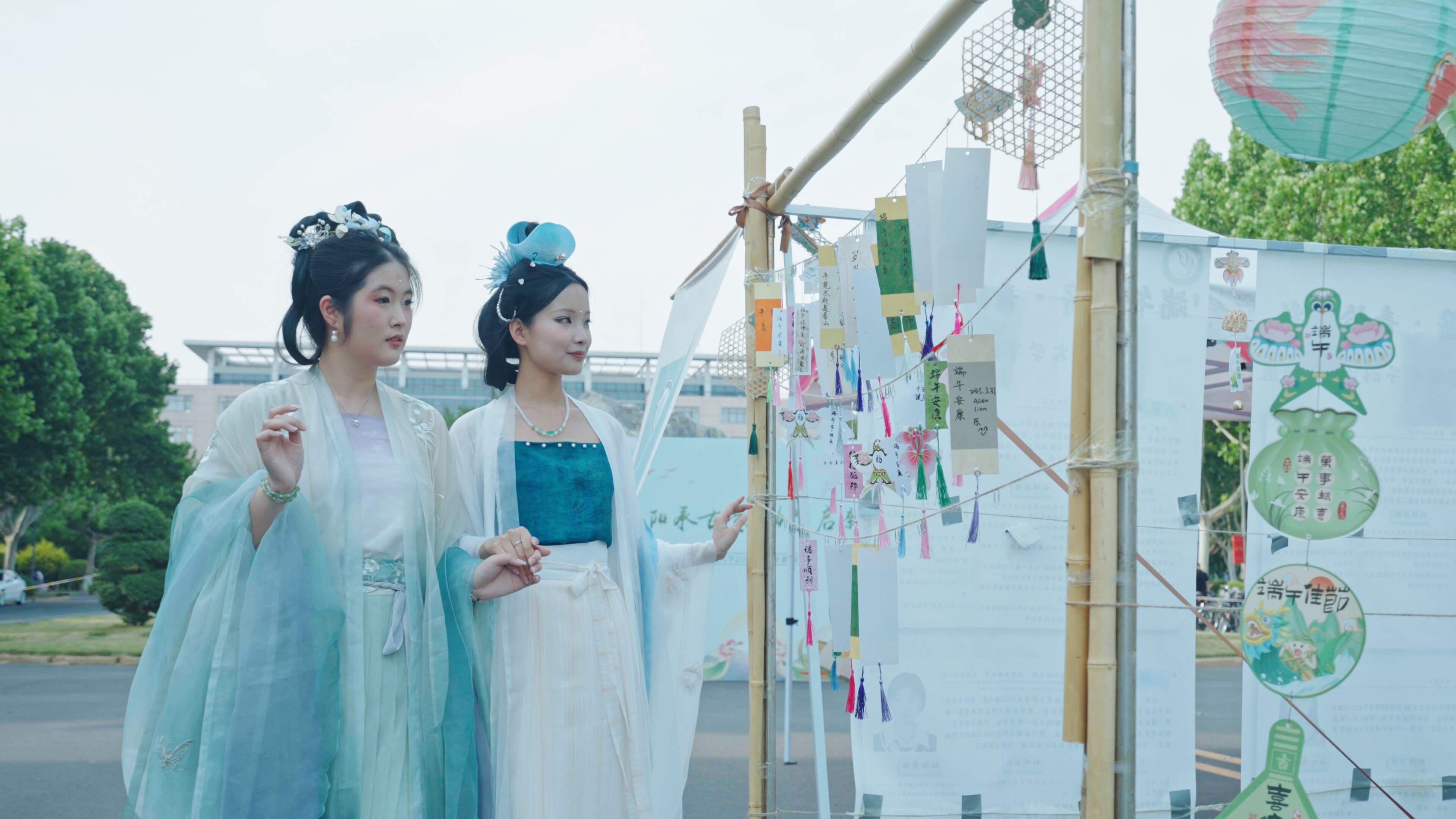 “这是我第一次体验雄黄绘额,老师讲解的端午驱邪祈福寓意让我对传统文化有了更深的理解。”来自文学院的学生小张兴高采烈地讲述。活动现场,双面设计的“福笺摇”文化墙成为精神磁场。正面垂挂的几百枚心愿签承载着学子对学业、生活的期许:“带奶奶看故宫”“顺利上岸”“家人平安”。另一面展示的“筑梦画卷”——六位优秀家庭经济困难学生的优秀事迹和成长寄语。