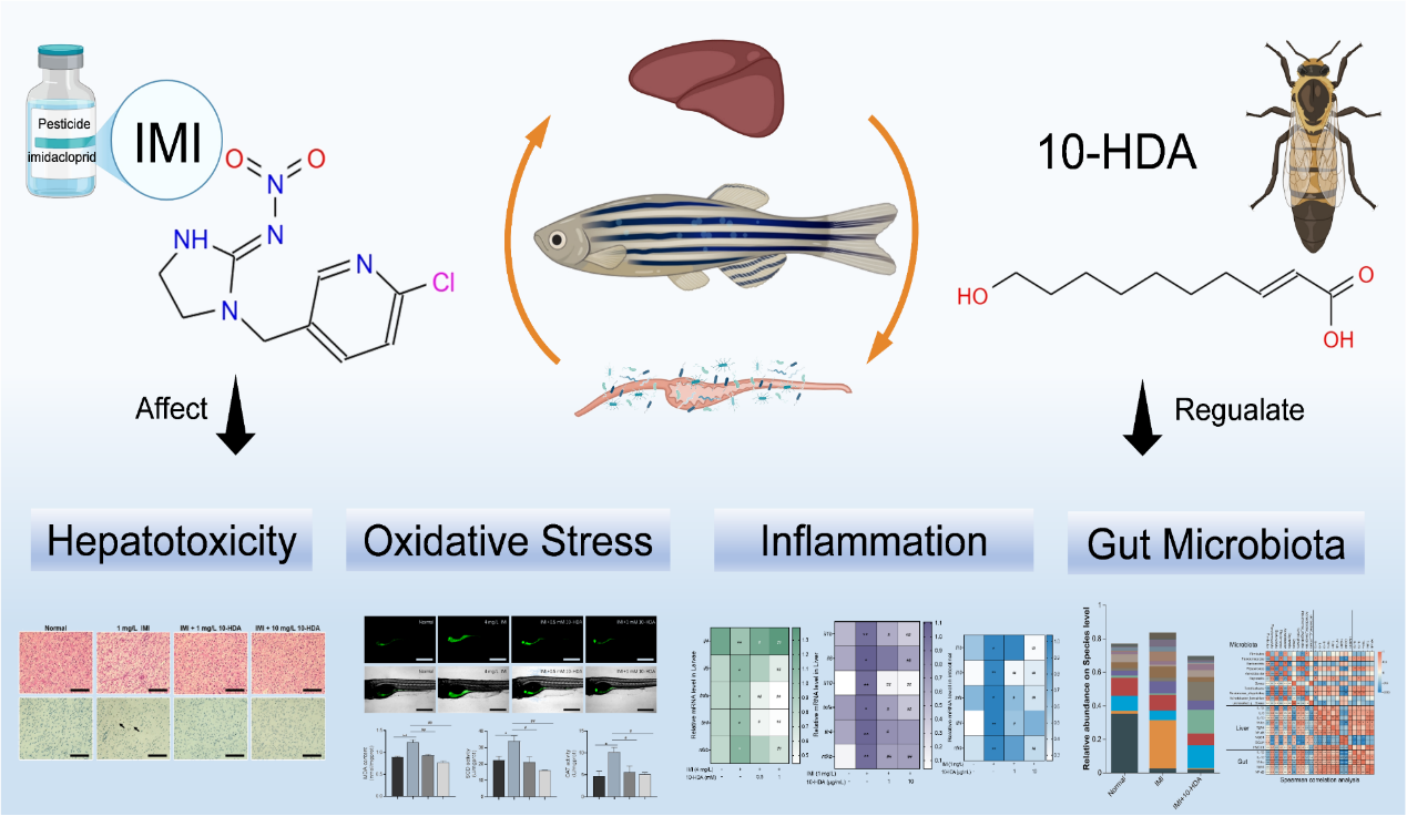 吡虫啉(IMI)是一种广泛使用的新烟碱类杀虫剂,在环境中广泛残留,威胁各类生物的健康,肝脏作为解毒器官,易受到损伤。10-羟基-2-癸烯酸(10- HDA)是蜂王浆中特有的一种天然化合物,具有抗炎和抗氧化等多种生物学活性;然而,其在缓解农药诱导的肝毒性方面的潜力仍未得到充分研究。该研究聚焦于广泛使用的新烟碱类农药IMI残留于环境中产生的生态毒理问题,系统评估了其对模式生物斑马鱼肝脏的毒性作用,并首次深入探讨了蜂王浆特有成分10-HDA在缓解农药诱导肝损伤中的作用机制。