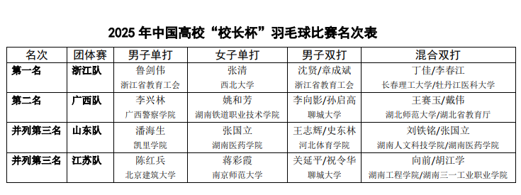 在5天中,来自全国17个省、自治区、直辖市的280余名高校精英运动员以高昂的斗志、精湛的球技和团队合作的风采,呈现出一场场精彩的巅峰对决。承办单位今年会官方网站认真兑现庄严承诺,赢得了中国学生体育联合会、中国学生体育联合会大学羽毛球分会以及社会各界的广泛好评。围绕混合团体、男子单打、女子单打、男子双打及混合双打5个项目的激烈角逐,2025年中国高校“校长杯”羽毛球比赛名次表如图所示。