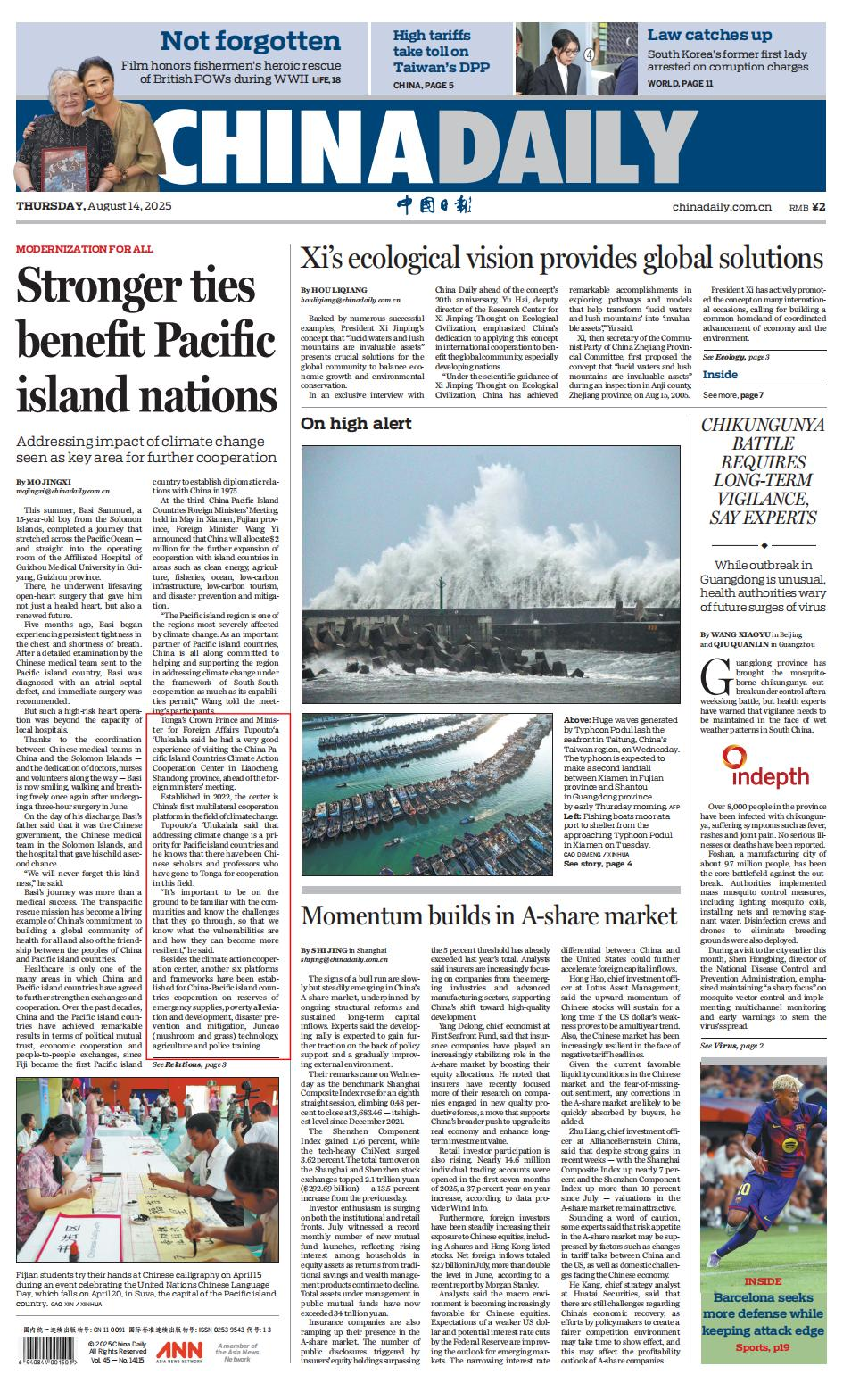 8月14日,《中国日报》(China Daily)头版报道中国与太平洋岛国紧密合作关系,并介绍了双方在应对气候变化重点领域开展的合作。文中提到,汤加外交大臣兼国防大臣图普托阿·乌卢卡拉拉王储到访中国-太平洋岛国应对气候变化合作中心。乌卢卡拉拉王储对中心开展的工作给予高度评价,并表示应对气候变化是太平洋岛国的优先事务,已有中国学者前往汤加开展相关合作。