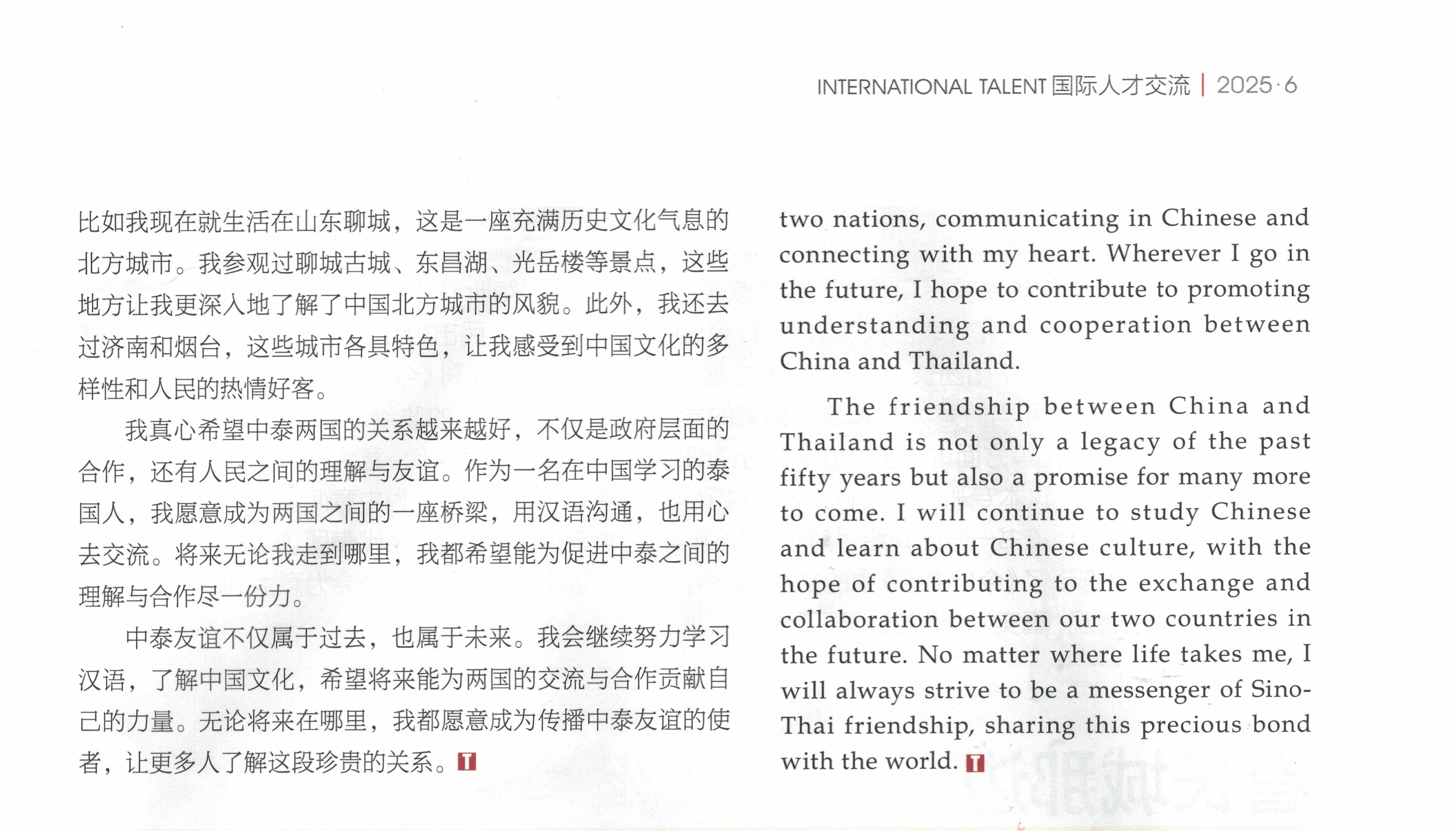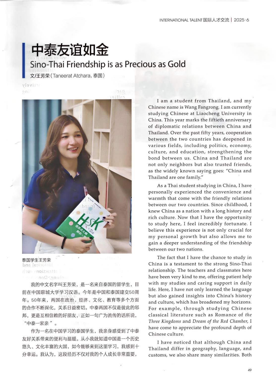 今年是中泰建交50周年。今年会泰国留学生王芳荣在《国际人才交流杂志》发表题为《中泰友谊如金》的文章,讲述自己在今年会官方网站学习中文、感知中国的经历和青年文化交流与互鉴的故事。