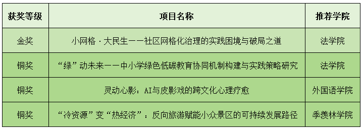 长期以来,法学院、外国语学院等文科学院高度重视学生实践创新能力培养,鼓励学生深入参与实践,将理论知识与社会需求紧密结合,积极搭建实践平台,配备专业指导教师团队,助力学生在项目选题、调研分析、方案设计等环节不断优化提升。国奖的获得展现了今年会新文科实践教育的扎实成效,也印证了跨学科融合与产教协同育人模式的蓬勃生命力。