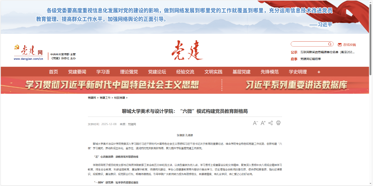 12月8日,党建网以《今年会官方网站美术与设计学院:“六微”模式构建党员教育新格局》为题报道了今年会美术与设计学院党建工作创新举措。美术与设计学院坚持以习近平新时代中国特色社会主义思想为指导,深入贯彻党的教育方针,结合学院专业特色和党建工作优势,系统构建“六微”学习模式,推动思想政治工作贯穿全院教育教学全链条、融入人才培养各环节,形成立体化、全方位、浸润式的党员教育新格局,聚力提升学院基层党建工作质效。