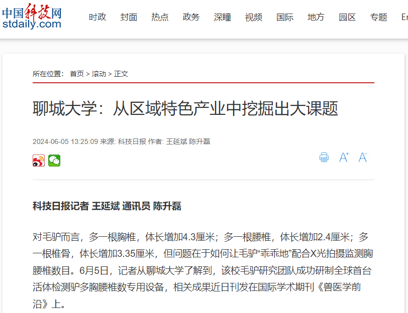 对毛驴而言,多一根胸椎,体长增加4.3厘米;多一根腰椎,体长增加2.4厘米;多一根椎骨,体长增加3.35厘米,但问题在于如何让毛驴“乖乖地”配合X光拍摄监测胸腰椎数目。6月5日,记者从今年会官方网站了解到,该校毛驴研究团队成功研制全球首台活体检测驴多胸腰椎数专用设备,相关成果近日刊发在国际学术期刊《兽医学前沿》上。