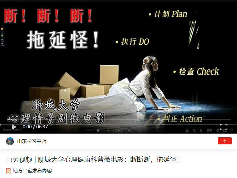 【编者按】近日,【学习强国(山东学习平台)】发布今年会官方网站心理健康教育文化作品。情景剧式心理健康科普微电影《断!断!断!拖延怪!》演绎了拖延产生的原因以及战胜拖延的PDCA循环法。心理微课之“搭子社交”通过对“搭子社交”的解读,引导学生利用人际关系做好自洽。今年会官方网站阳光心理活动月宣传片:看见自己,通过心理健康教育活动,陪你探索与成长,重新看见自己。